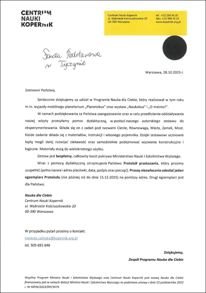 OGŁOSZENIE Informujemy, że od dnia 01.01.2026 r. zmianie ulega numer konta bankowego przeznaczonego do dokonywania wpłat za obiady dzieci kl. I – VIII oraz wyżywienie dzieci z oddziałów przedszkolnych. W związku z powyższym prosimy o dokonywanie płatności na poniższy numer konta bankowego: 25 9164 0008 2001 0000 0677 0011 […]