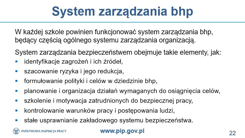 Nasza szkoła podjęła współpracę z Państwową Inspekcją Pracy w ramach programu profilaktycznego „Bezpiecznie w szkołach”. Celem uruchomionego programu jest popularyzacja wymagań prawnych oraz dobrych praktyk w zakresie działań polegających na zapobieganiu i redukcji zagrożeń w szkołach, ze szczególnym uwzględnieniem ochrony zdrowia w czasie pandemii.W naszej szkole inspektor PIP przeprowadził takie szkolenie, w którym upowszechniane były zagadnienia bezpieczeństwa i higieny pracy, w tym związane z dokonaniem prawidłowej oceny ryzyka zawodowego. Wsparciem tych działań jest również doradztwo PIP w zakresie bezpiecznych warunków pracy, uzupełnione dystrybucją tematycznych plakatów, prezentujących dobre praktyki i rozwiązania antykowidowe. Realizacja programu uwzględnia również wymianę informacji ze służbami sanitarnymi w zakresie nieprawidłowości dotyczących zagadnień leżących w kompetencjach Państwowej Inspekcji Sanitarnej.