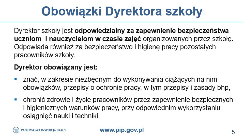 Nasza szkoła podjęła współpracę z Państwową Inspekcją Pracy w ramach programu profilaktycznego „Bezpiecznie w szkołach”. Celem uruchomionego programu jest popularyzacja wymagań prawnych oraz dobrych praktyk w zakresie działań polegających na zapobieganiu i redukcji zagrożeń w szkołach, ze szczególnym uwzględnieniem ochrony zdrowia w czasie pandemii.W naszej szkole inspektor PIP przeprowadził takie szkolenie, w którym upowszechniane były zagadnienia bezpieczeństwa i higieny pracy, w tym związane z dokonaniem prawidłowej oceny ryzyka zawodowego. Wsparciem tych działań jest również doradztwo PIP w zakresie bezpiecznych warunków pracy, uzupełnione dystrybucją tematycznych plakatów, prezentujących dobre praktyki i rozwiązania antykowidowe. Realizacja programu uwzględnia również wymianę informacji ze służbami sanitarnymi w zakresie nieprawidłowości dotyczących zagadnień leżących w kompetencjach Państwowej Inspekcji Sanitarnej.