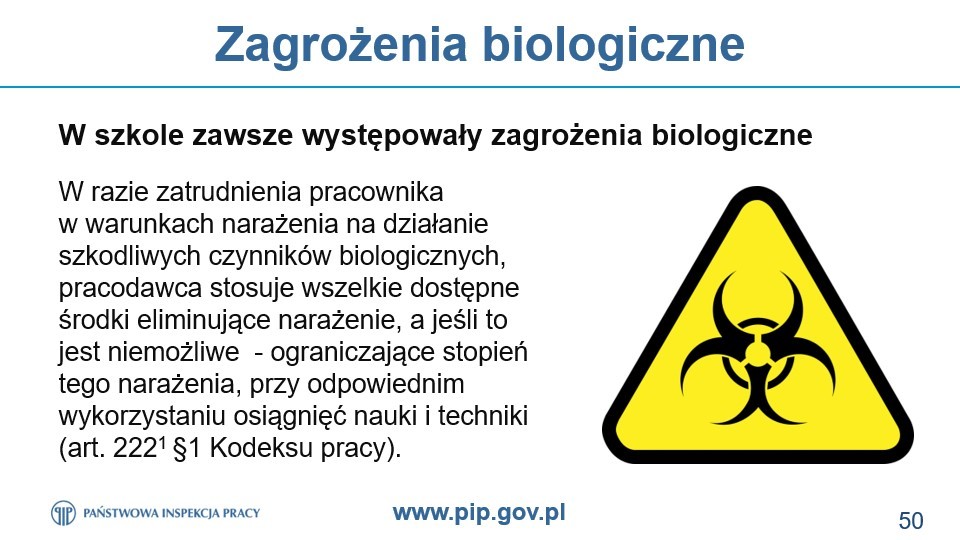 Nasza szkoła podjęła współpracę z Państwową Inspekcją Pracy w ramach programu profilaktycznego „Bezpiecznie w szkołach”. Celem uruchomionego programu jest popularyzacja wymagań prawnych oraz dobrych praktyk w zakresie działań polegających na zapobieganiu i redukcji zagrożeń w szkołach, ze szczególnym uwzględnieniem ochrony zdrowia w czasie pandemii.W naszej szkole inspektor PIP przeprowadził takie szkolenie, w którym upowszechniane były zagadnienia bezpieczeństwa i higieny pracy, w tym związane z dokonaniem prawidłowej oceny ryzyka zawodowego. Wsparciem tych działań jest również doradztwo PIP w zakresie bezpiecznych warunków pracy, uzupełnione dystrybucją tematycznych plakatów, prezentujących dobre praktyki i rozwiązania antykowidowe. Realizacja programu uwzględnia również wymianę informacji ze służbami sanitarnymi w zakresie nieprawidłowości dotyczących zagadnień leżących w kompetencjach Państwowej Inspekcji Sanitarnej.