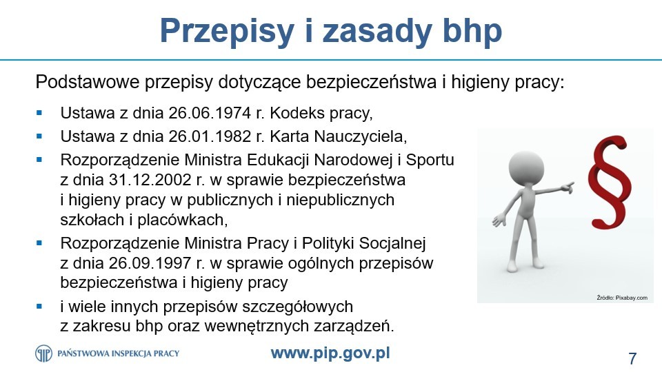 Nasza szkoła podjęła współpracę z Państwową Inspekcją Pracy w ramach programu profilaktycznego „Bezpiecznie w szkołach”. Celem uruchomionego programu jest popularyzacja wymagań prawnych oraz dobrych praktyk w zakresie działań polegających na zapobieganiu i redukcji zagrożeń w szkołach, ze szczególnym uwzględnieniem ochrony zdrowia w czasie pandemii.W naszej szkole inspektor PIP przeprowadził takie szkolenie, w którym upowszechniane były zagadnienia bezpieczeństwa i higieny pracy, w tym związane z dokonaniem prawidłowej oceny ryzyka zawodowego. Wsparciem tych działań jest również doradztwo PIP w zakresie bezpiecznych warunków pracy, uzupełnione dystrybucją tematycznych plakatów, prezentujących dobre praktyki i rozwiązania antykowidowe. Realizacja programu uwzględnia również wymianę informacji ze służbami sanitarnymi w zakresie nieprawidłowości dotyczących zagadnień leżących w kompetencjach Państwowej Inspekcji Sanitarnej.