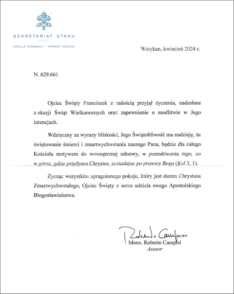 List z błogosławieństwem od papieża Franciszka z okazji świąt Wielkanocnych.