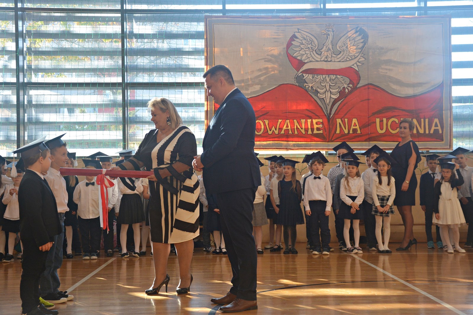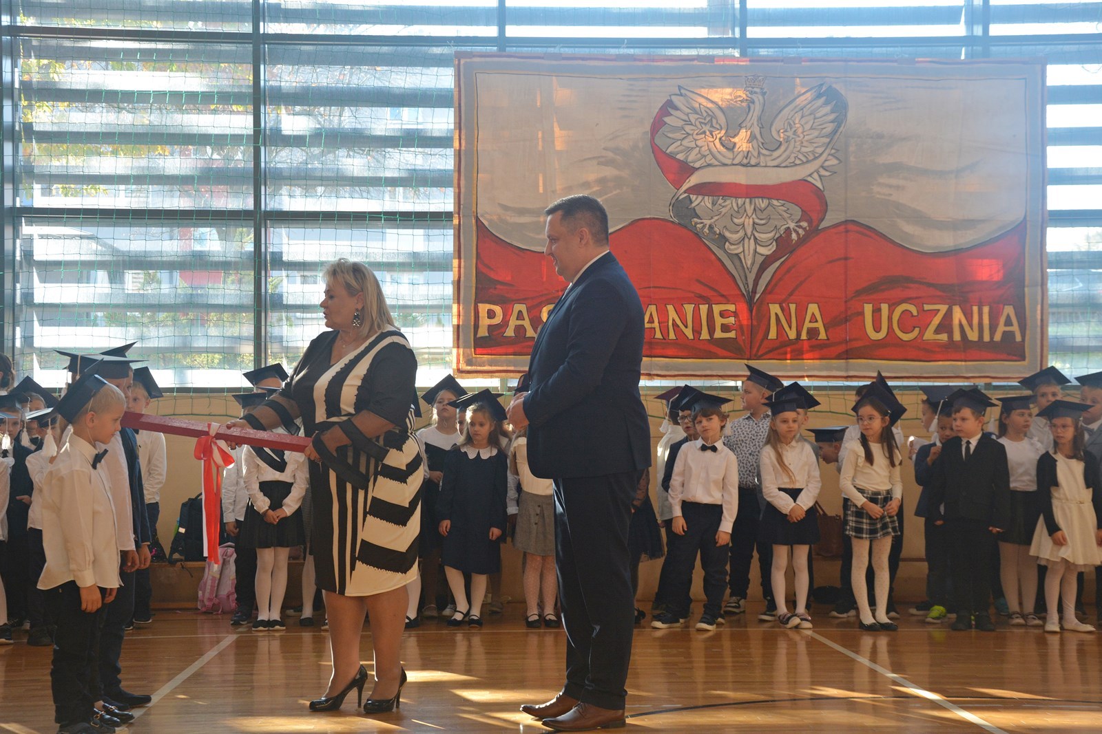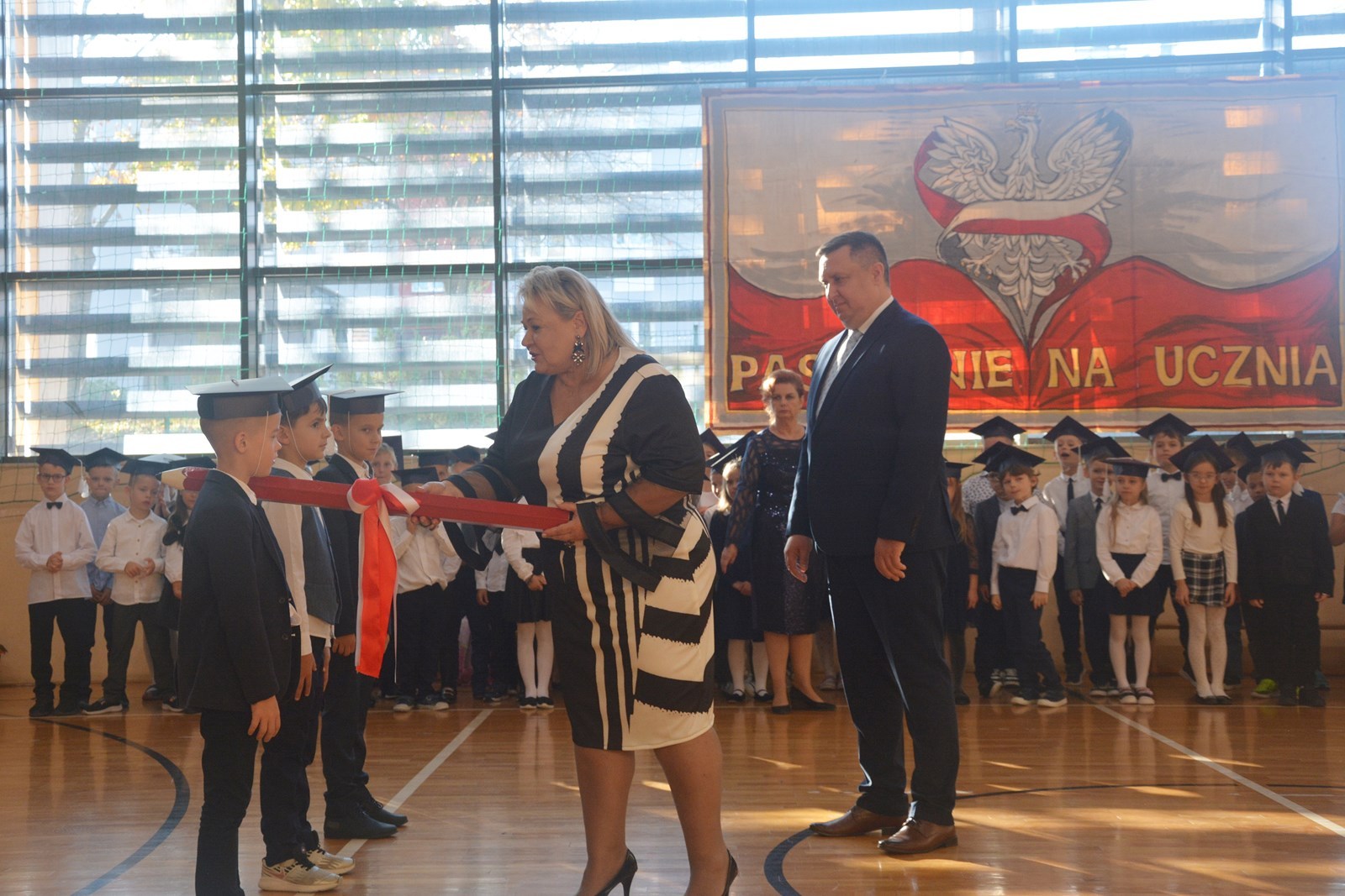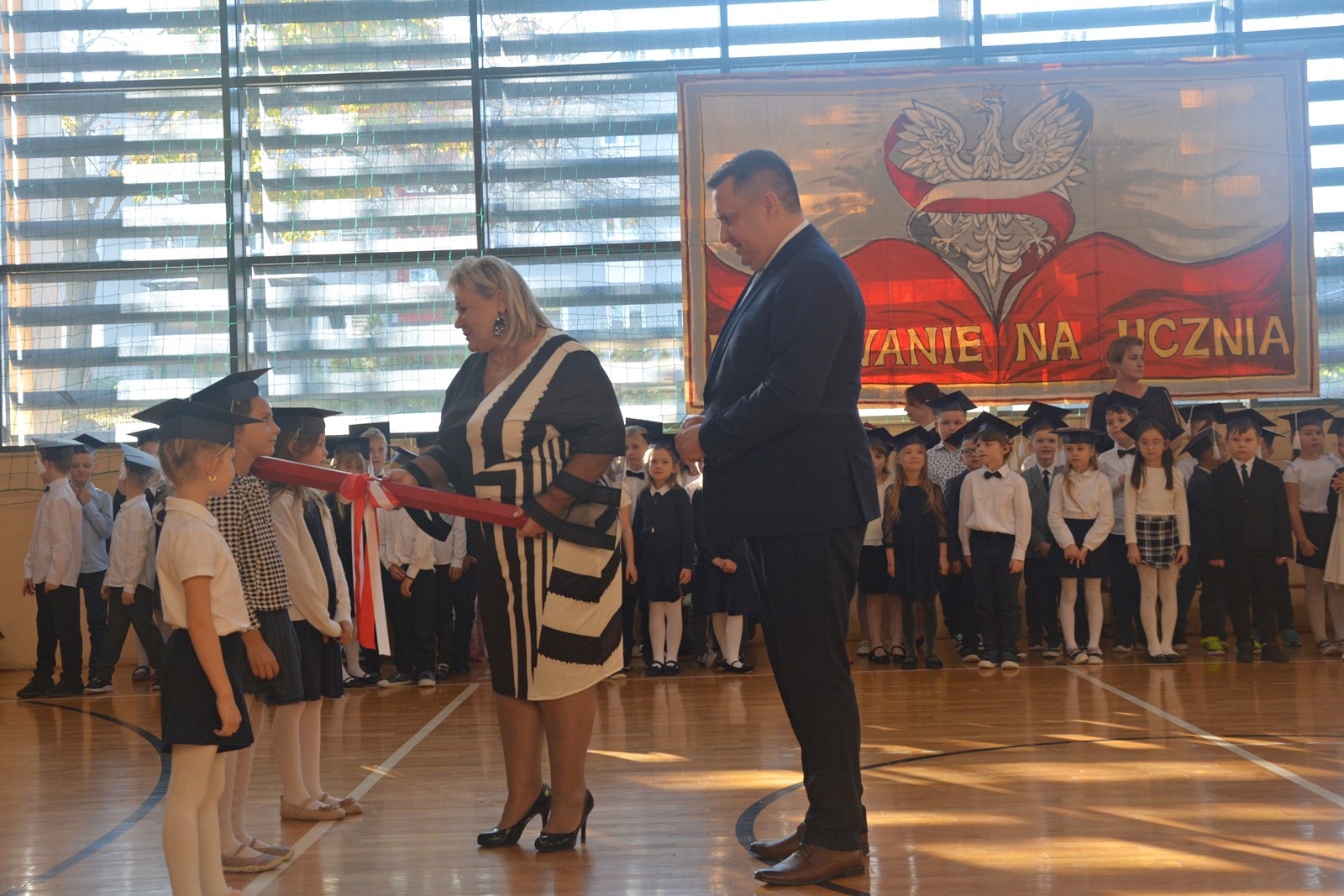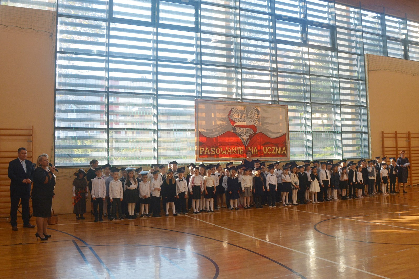 Następnie odbyło się uroczyste ślubowanie w obecności sztandaru szkoły. Dyrektor Zofia Międlar–Mruk i wicedyrektor Adam Janiec przyjęli ślubowanie pierwszaków i  pasowali ich na uczniów. Wszyscy uczniowie klas pierwszych obiecali uczyć się pilnie, być  życzliwymi oraz szanować dobre imię szkoły. Po uroczystości nasi mali bohaterowie otrzymali legitymacje uczniowskie oraz upominki ufundowane przez dyrektora i Radę Rodziców. Cała uroczystość wypadła wspaniale i na długo zostanie w pamięci wszystkich uczestników.