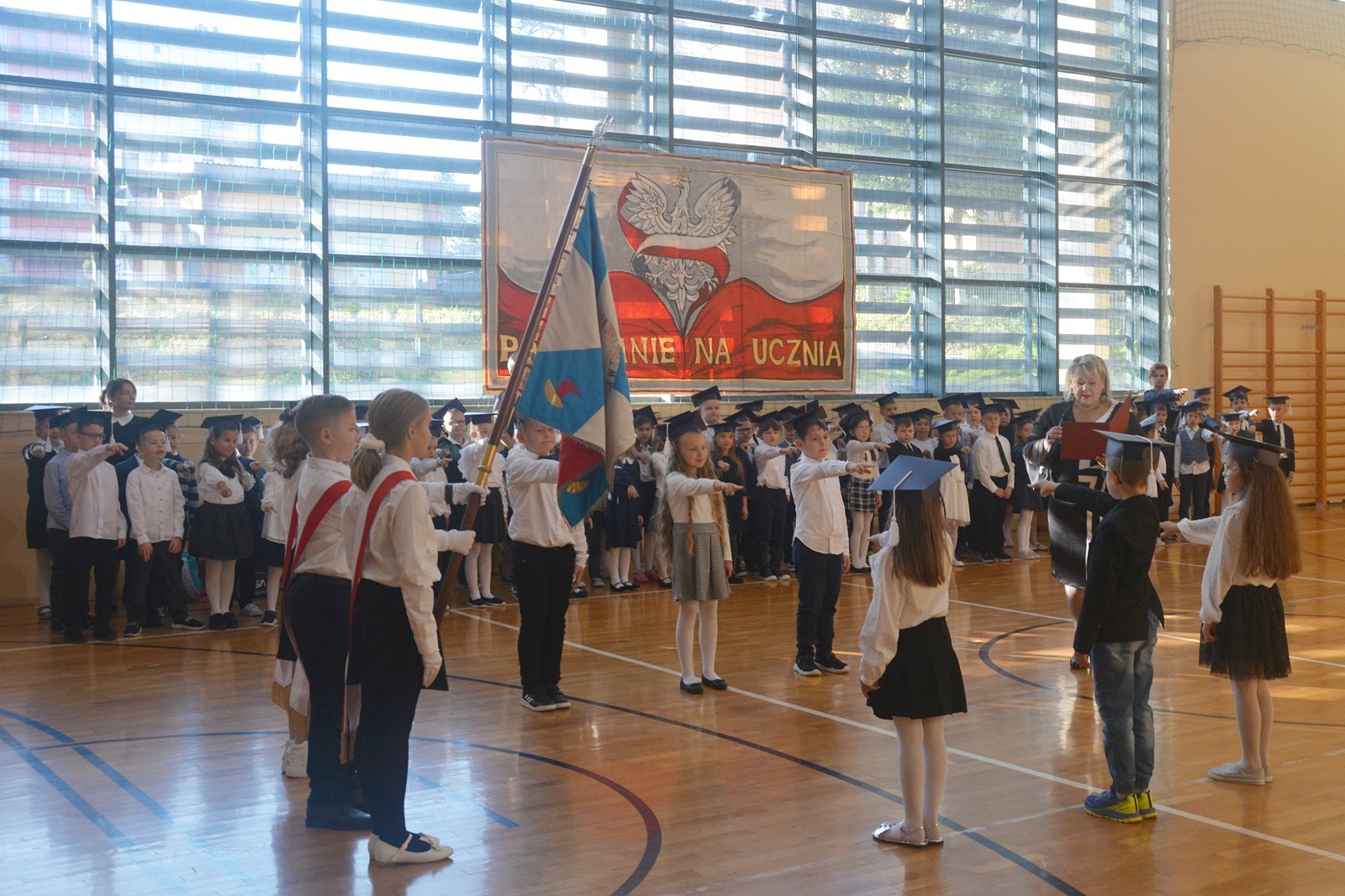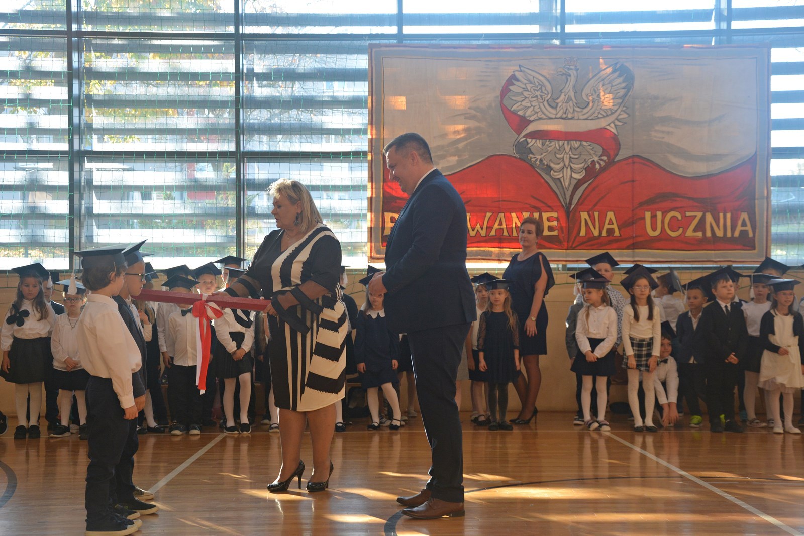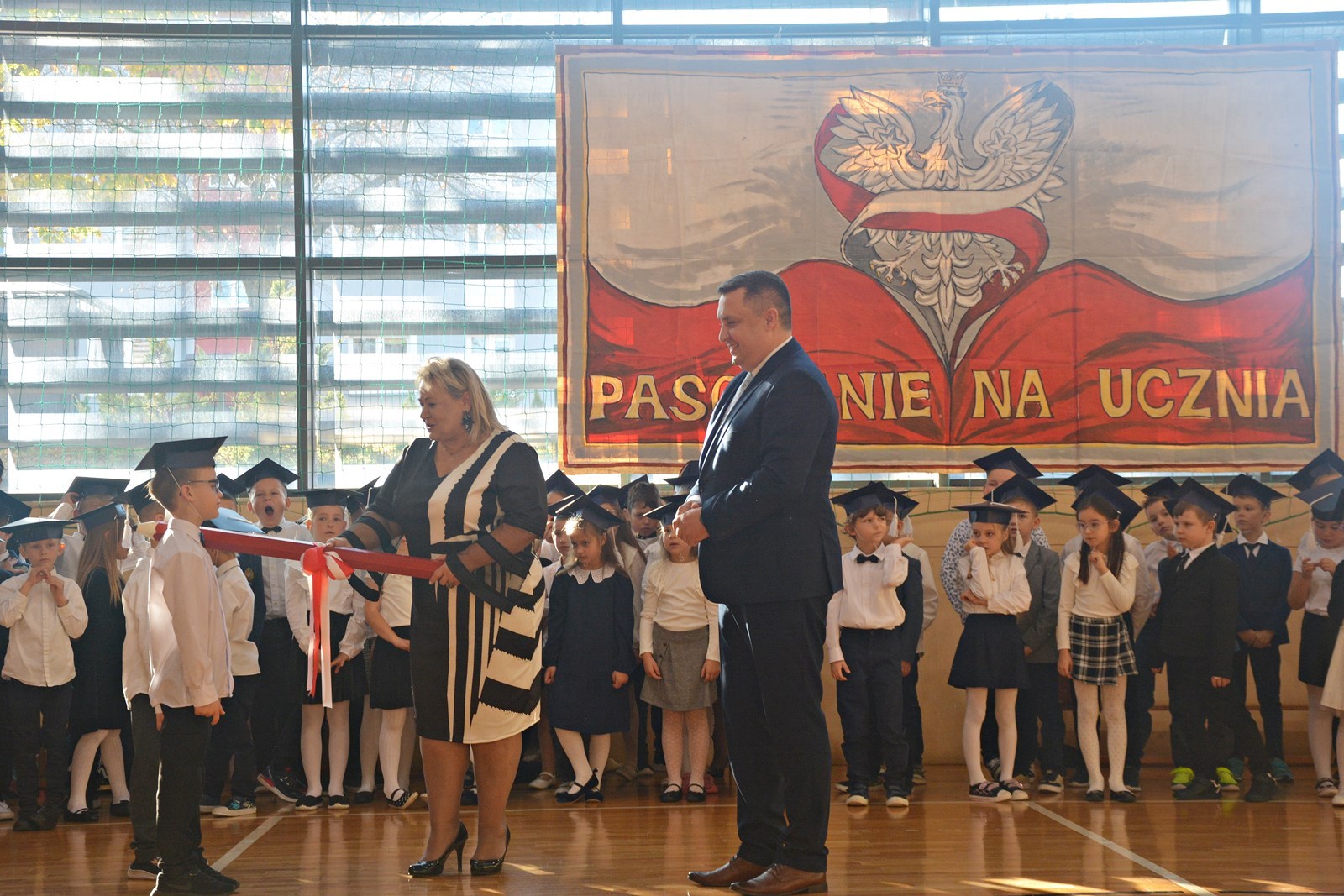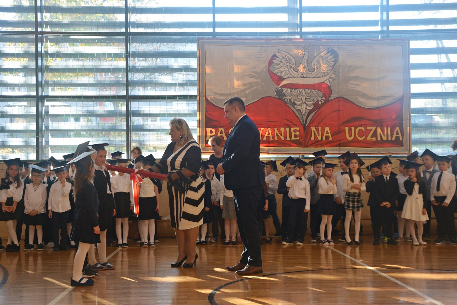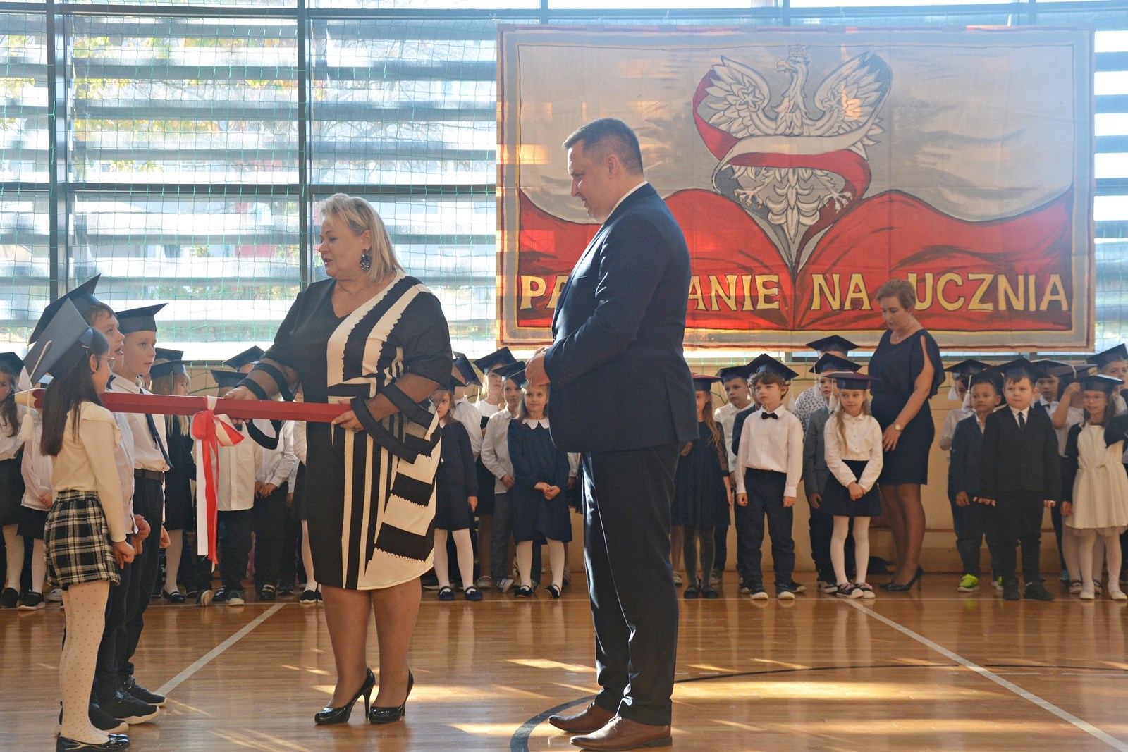 Następnie odbyło się uroczyste ślubowanie w obecności sztandaru szkoły. Dyrektor Zofia Międlar–Mruk i wicedyrektor Adam Janiec przyjęli ślubowanie pierwszaków i  pasowali ich na uczniów. Wszyscy uczniowie klas pierwszych obiecali uczyć się pilnie, być  życzliwymi oraz szanować dobre imię szkoły. Po uroczystości nasi mali bohaterowie otrzymali legitymacje uczniowskie oraz upominki ufundowane przez dyrektora i Radę Rodziców. Cała uroczystość wypadła wspaniale i na długo zostanie w pamięci wszystkich uczestników.