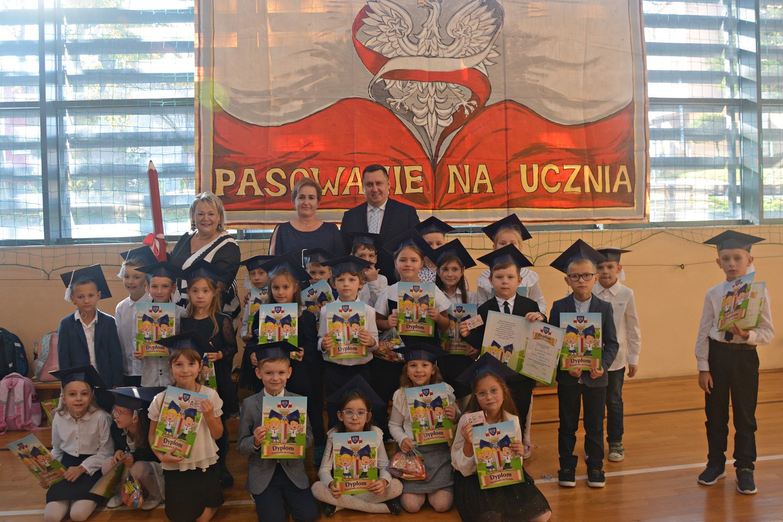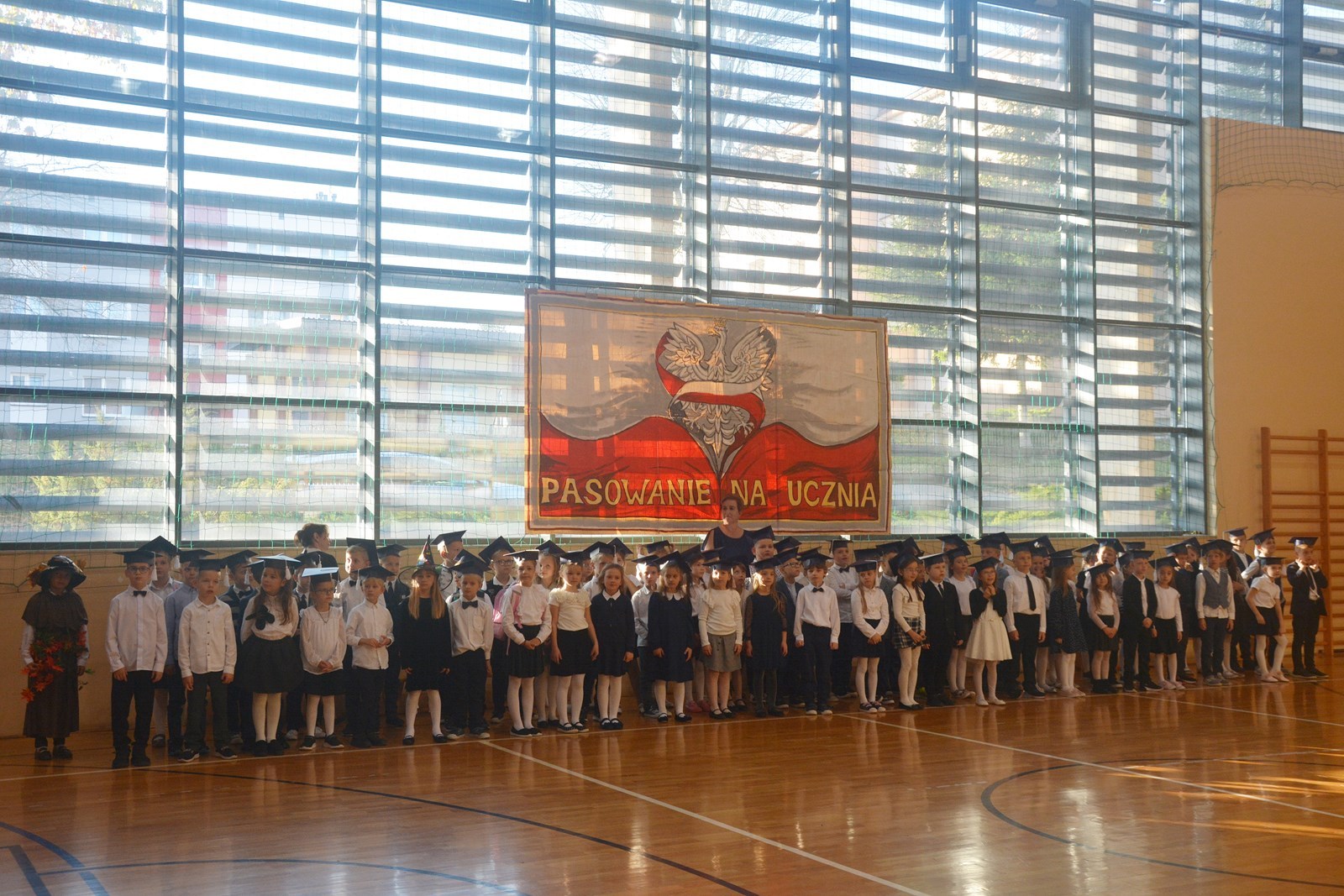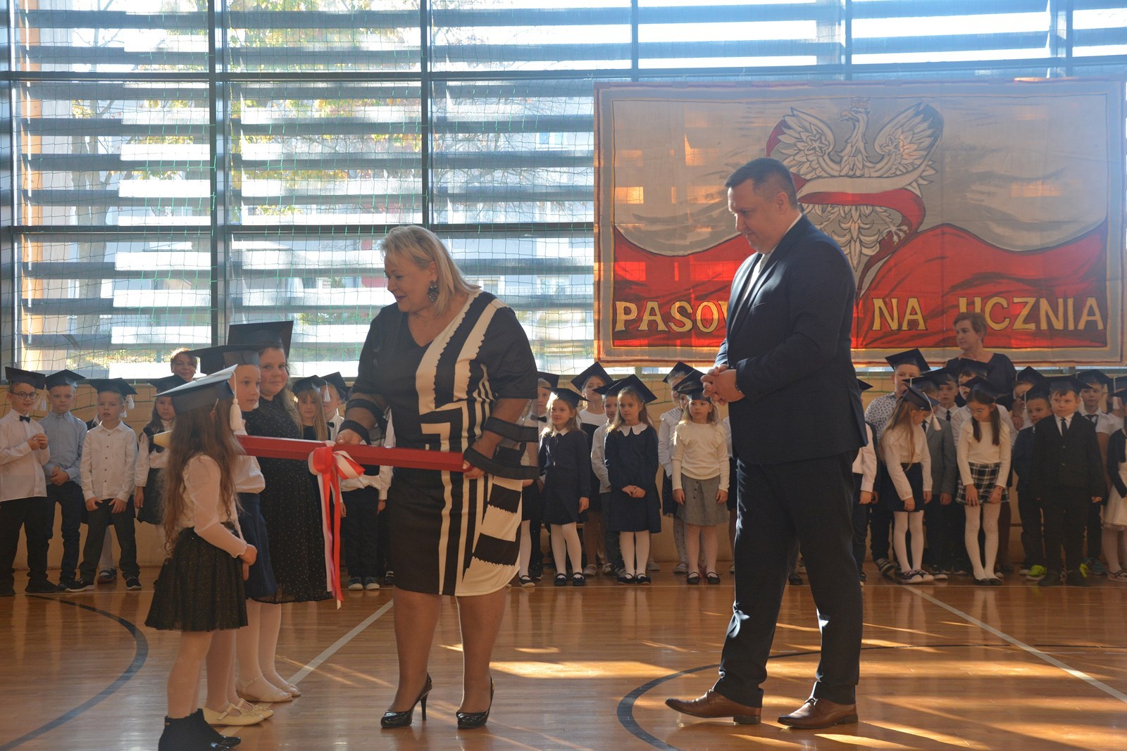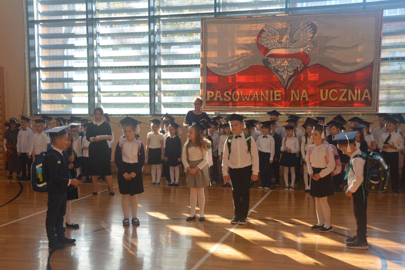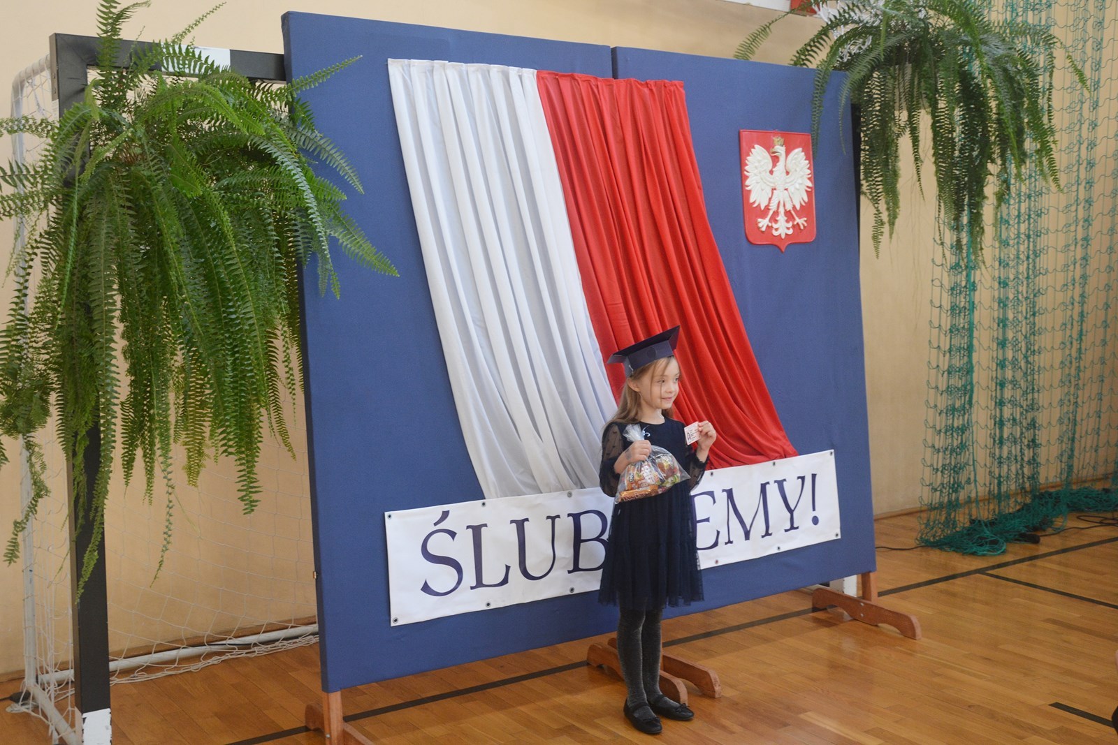 Następnie odbyło się uroczyste ślubowanie w obecności sztandaru szkoły. Dyrektor Zofia Międlar–Mruk i wicedyrektor Adam Janiec przyjęli ślubowanie pierwszaków i  pasowali ich na uczniów. Wszyscy uczniowie klas pierwszych obiecali uczyć się pilnie, być  życzliwymi oraz szanować dobre imię szkoły. Po uroczystości nasi mali bohaterowie otrzymali legitymacje uczniowskie oraz upominki ufundowane przez dyrektora i Radę Rodziców. Cała uroczystość wypadła wspaniale i na długo zostanie w pamięci wszystkich uczestników.