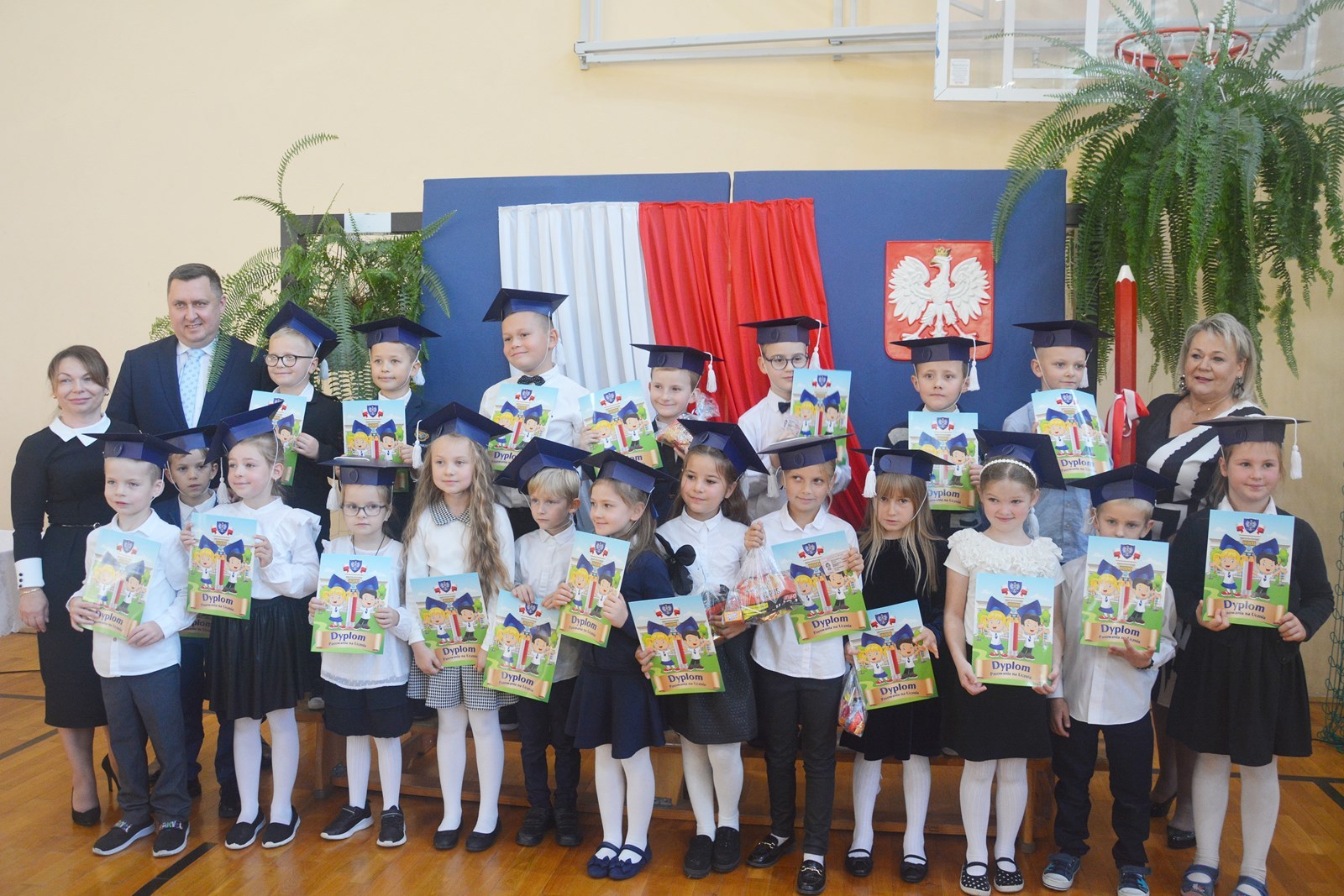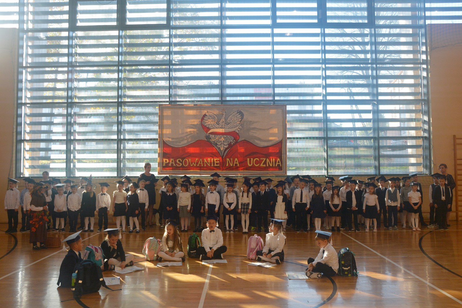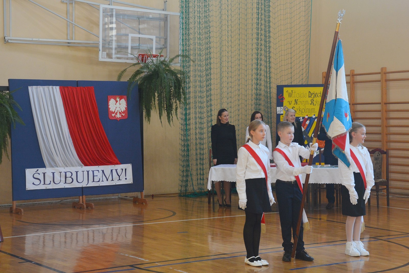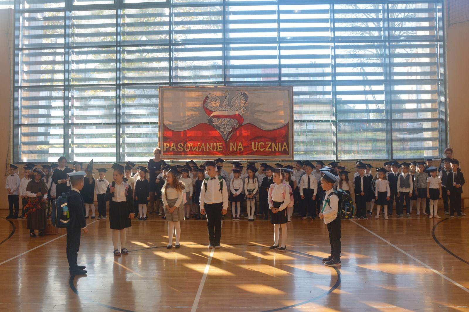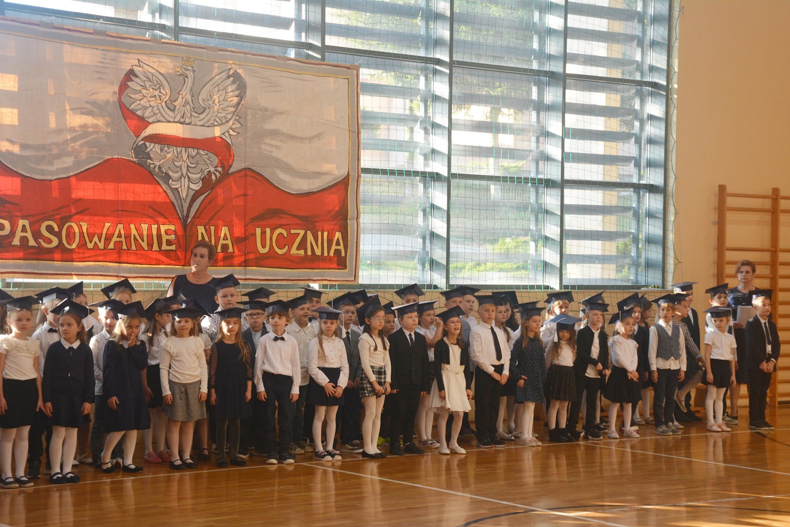 Następnie odbyło się uroczyste ślubowanie w obecności sztandaru szkoły. Dyrektor Zofia Międlar–Mruk i wicedyrektor Adam Janiec przyjęli ślubowanie pierwszaków i  pasowali ich na uczniów. Wszyscy uczniowie klas pierwszych obiecali uczyć się pilnie, być  życzliwymi oraz szanować dobre imię szkoły. Po uroczystości nasi mali bohaterowie otrzymali legitymacje uczniowskie oraz upominki ufundowane przez dyrektora i Radę Rodziców. Cała uroczystość wypadła wspaniale i na długo zostanie w pamięci wszystkich uczestników.