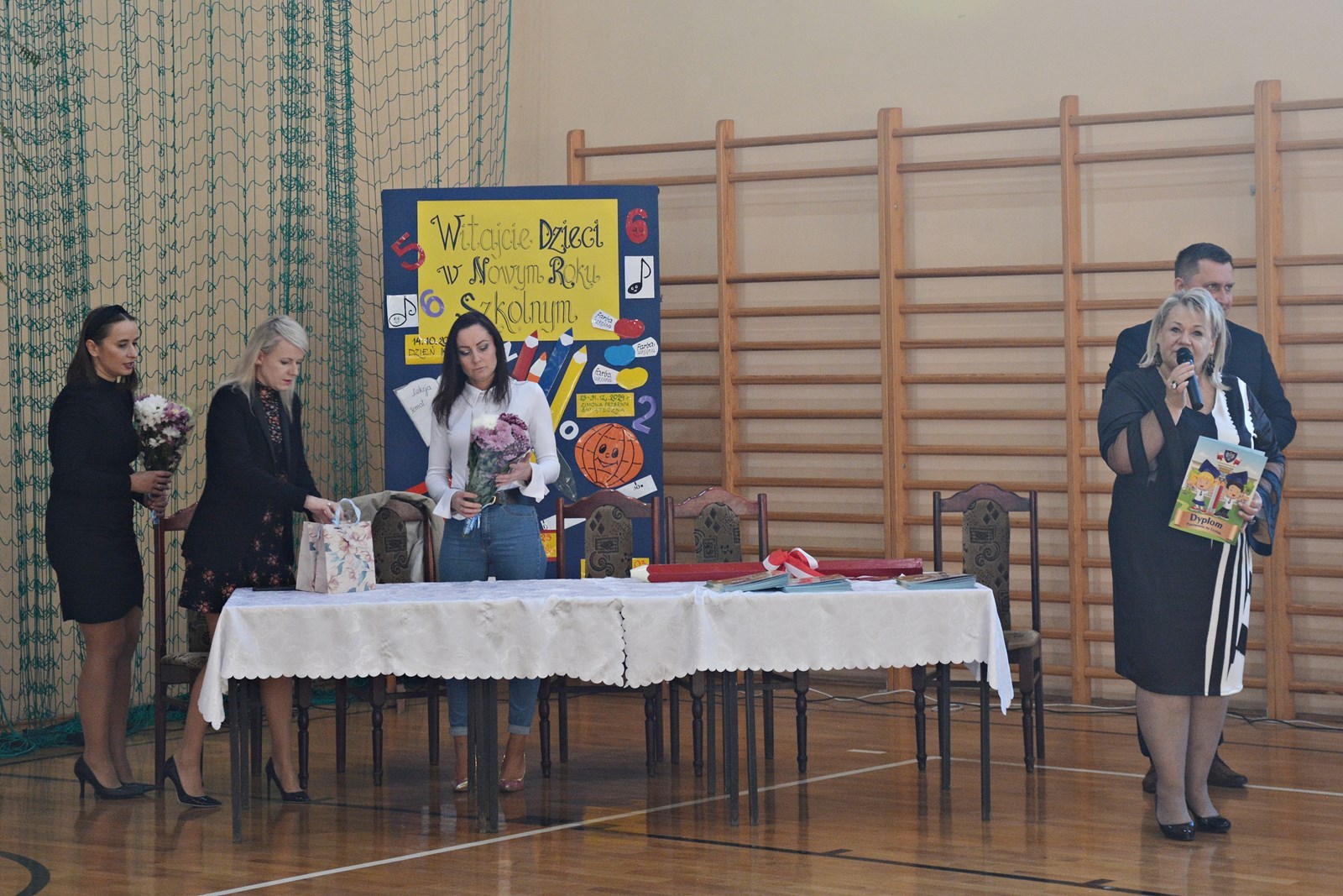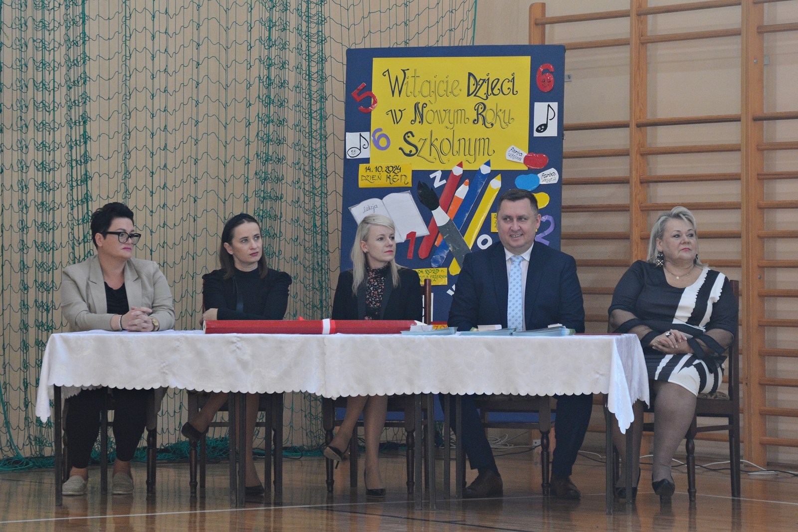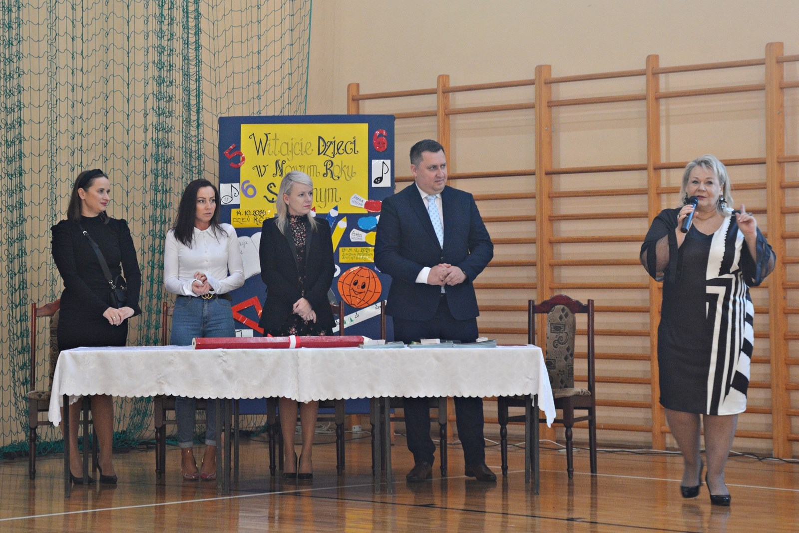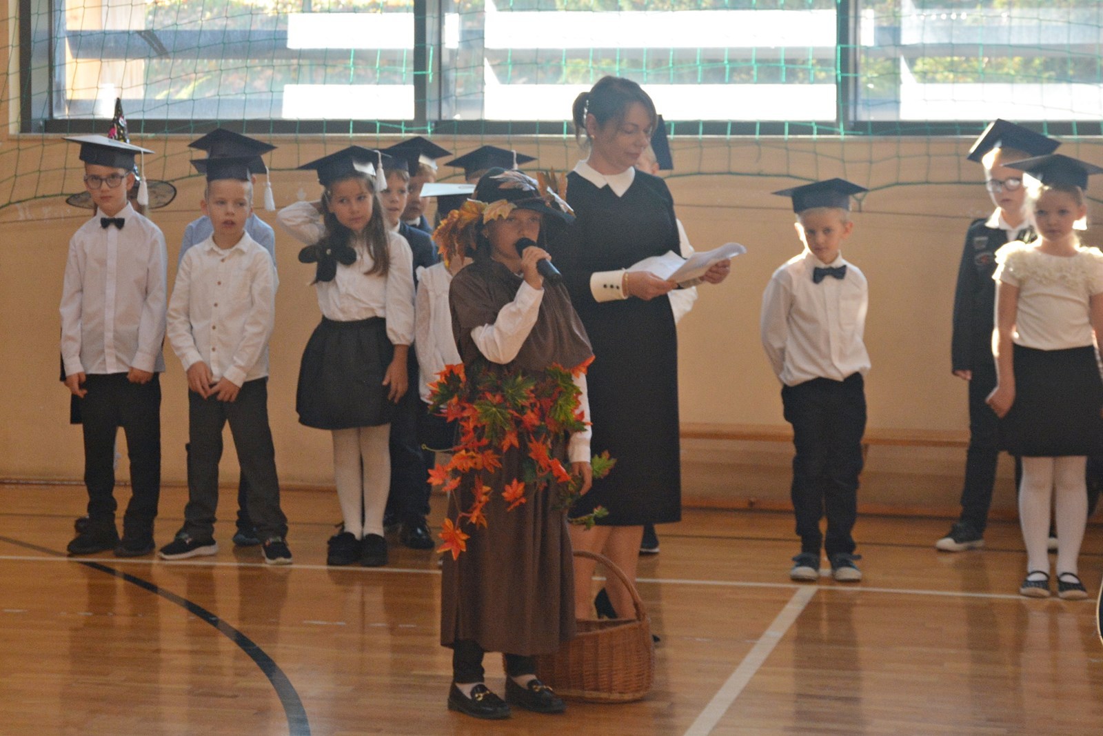 Spotkanie rozpoczęło się wystąpieniem dyrektor szkoły, pani Zofii Międlar-Mruk, która serdecznie powitała wszystkich zebranych i podkreśliła, że pierwszoklasiści po „egzaminie” dojrzałości szkolnej i akcie ślubowania zostaną już oficjalnie przyjęci do społeczności szkolnej. Zanim jednak najważniejsi uczestnicy wydarzenia zostali przyjęci do grona uczniów, musieli wykazać się umiejętnościami śpiewu, deklamacji, wiedzą o Polsce oraz znajomością zasad zachowania w szkole i na drodze. Klasy przygotowały program słowno-muzyczny pt. „Egzamin u pani Jesieni”. Młodzi artyści z dużym przejęciem recytowali wiersze i śpiewali piosenki.  Mimo stresu, związanego z pierwszym publicznym występem, wszyscy świetnie poradzili sobie z debiutem. Udowodnili tym samym, że zasługują na przyjęcie w poczet uczniów SP Tyczyn.
