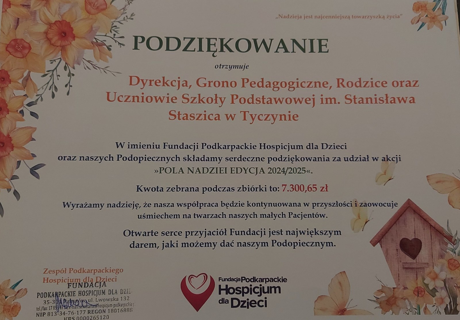 Nie zawiedliśmy! Jak zwykle empatia, wspaniałomyślność, wrażliwość a przede wszystkim integracja całej tyczyńskiej społeczności przyniosła sukces! Zawsze odpowiadamy na potrzeby innych. Potrafimy się dzielić! Pola Nadziei to jedna z licznych akcji charytatywnych w jakie włącza się nasza szkoła. Wolontariusze przez cały miesiąc w szkole oraz w niedzielę 30 marca po każdej mszy świętej kolejny już raz zaangażowali się w akcję dla Podopiecznych Fundacji Podkarpackiego Hospicjum dla Dzieci. Rozprowadzali żonkile, balony, naklejki, ulotki i zbierali datki do puszek. Dziękujemy z całego serca wszystkim, którzy wspierają nasze działania i tym, którzy przyczynili się do tej akcji.