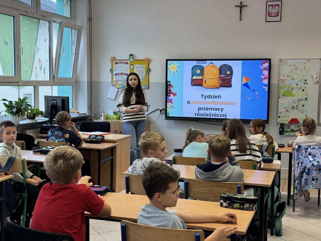 W klasach 1-3: wyeksponowano gazetki tematyczne w holu szkoły; odbyły się pogadanki, zajęcia tematyczne prowadzone przez wychowawców; warsztaty prowadzone przez pedagogów szkolnych, psychologa szkolnego, nauczycieli współorganizujących proces kształcenia; każda klasa wykonała wspólnie jeden plakat dotyczący tematyki przeciwdziałania przemocy, który został wyeksponowany w korytarzu szkolnym; przeprowadzono ankietę dla uczniów klas 3, dotyczącą relacji rówieśniczych w klasie; odbyła się prelekcja dla uczniów przez radiolę szkolną wygłoszona przez pedagoga szkolnego.