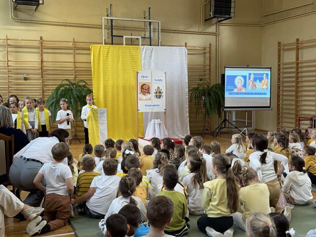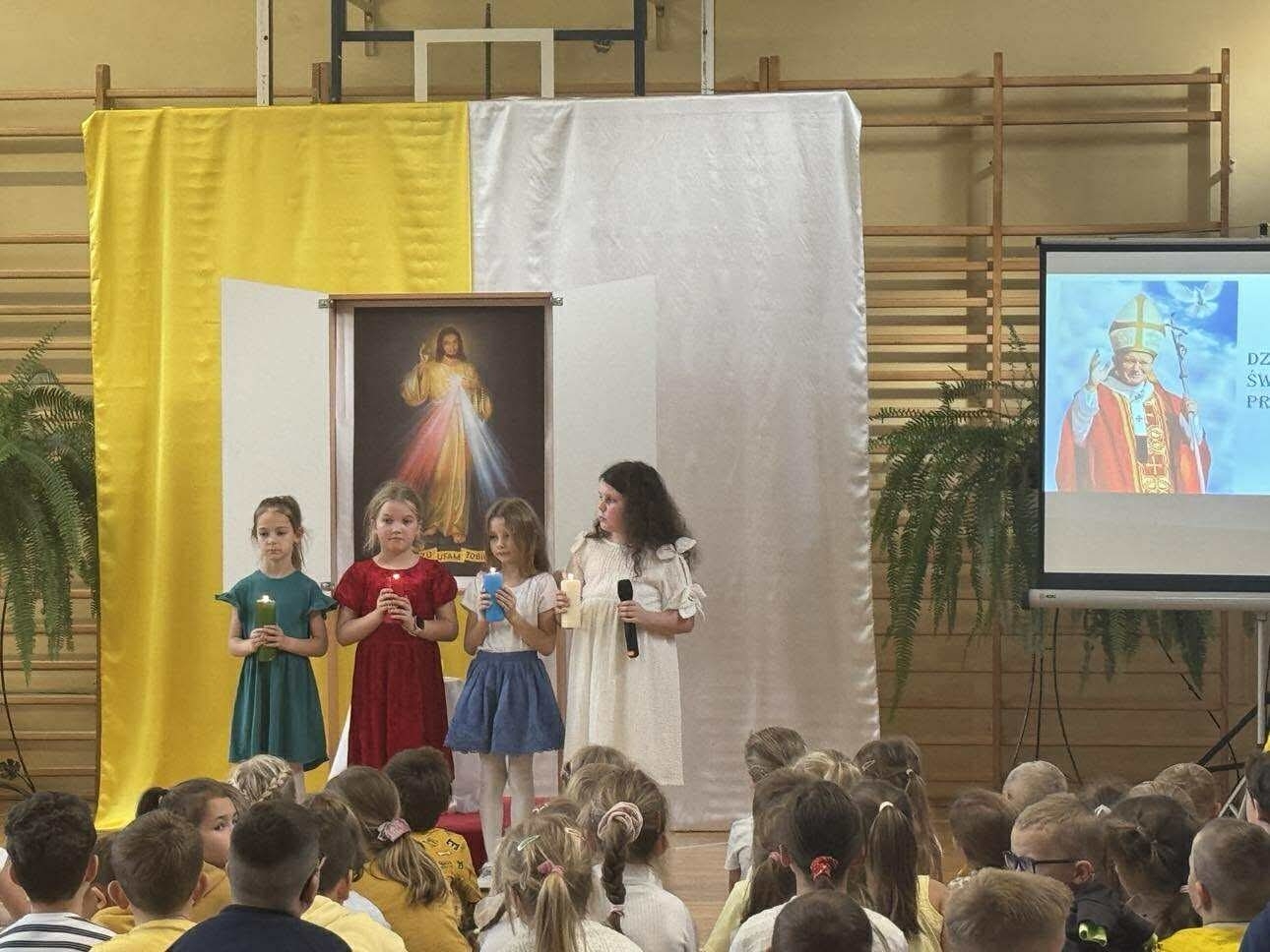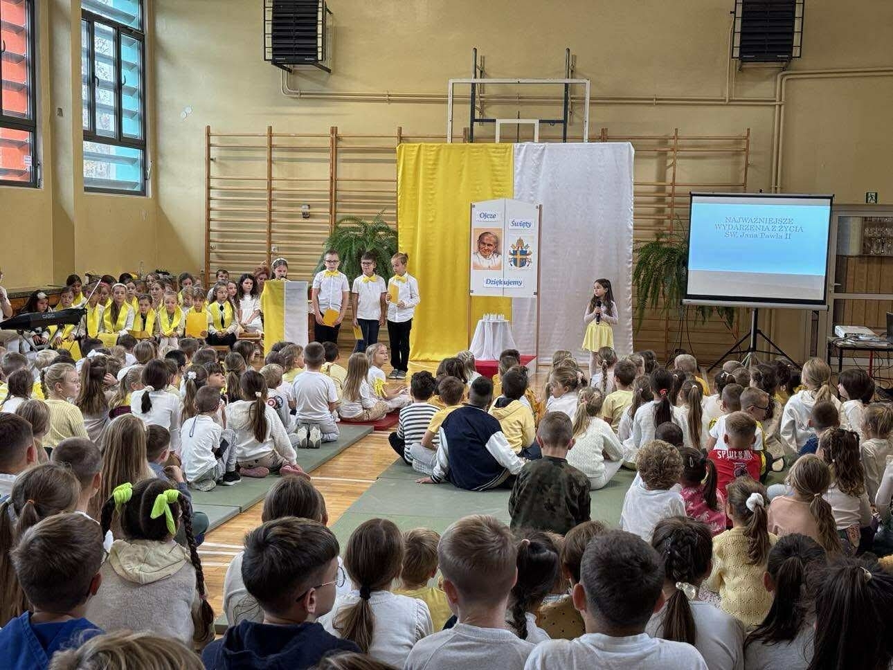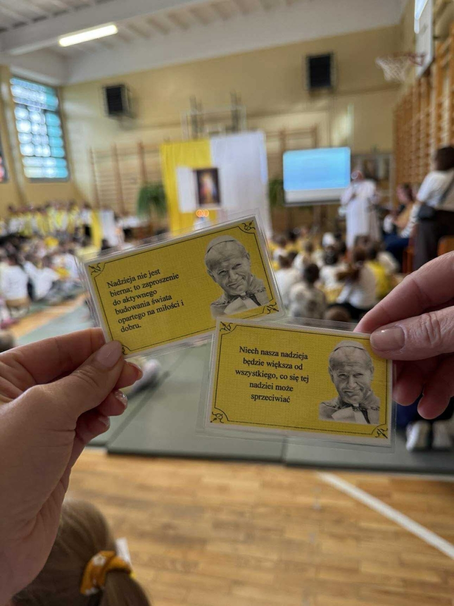 W czasie apelu przedstawiono najważniejsze wydarzenia z życia Jana Pawła II oraz słowa, które do dziś są dla wielu źródłem siły i nadziei. Uczniowie recytowali wiersze, śpiewali pieśni, a całość uświetniła prezentacja multimedialna. W tym dniu w szkole panowała wyjątkowa, uroczysta atmosfera, którą podkreślały żółto-białestroje uczniów i nauczycieli. Oczywiście nie zabrakło tradycyjnych kremówek- rozprowadzanych przez szkolny Caritas.