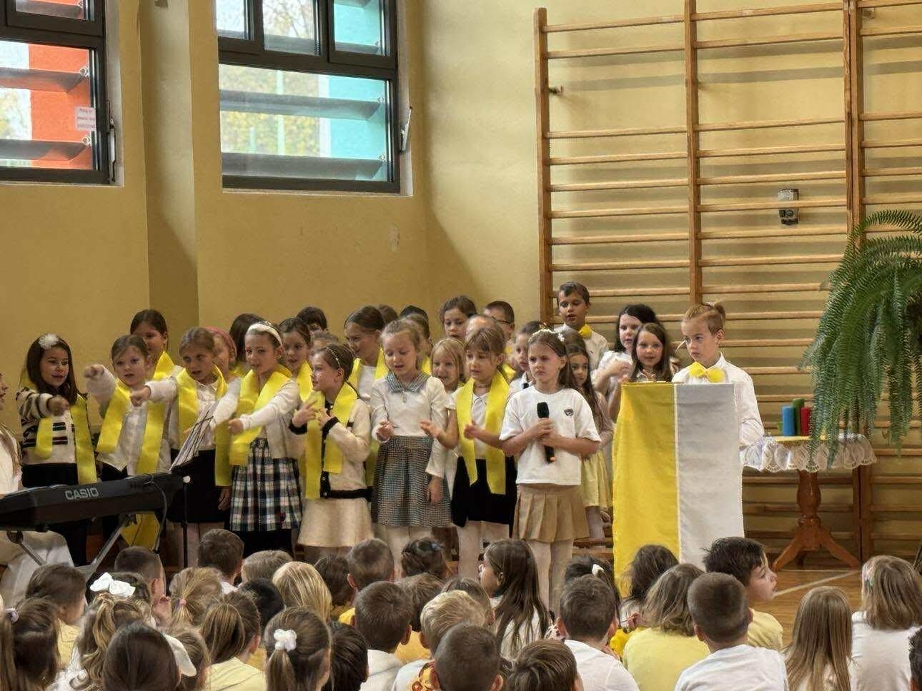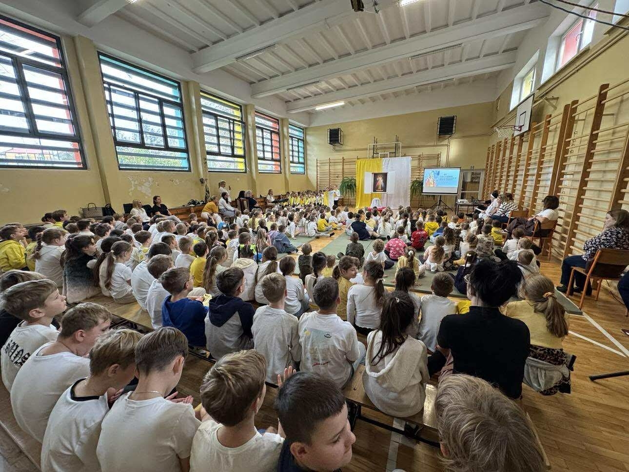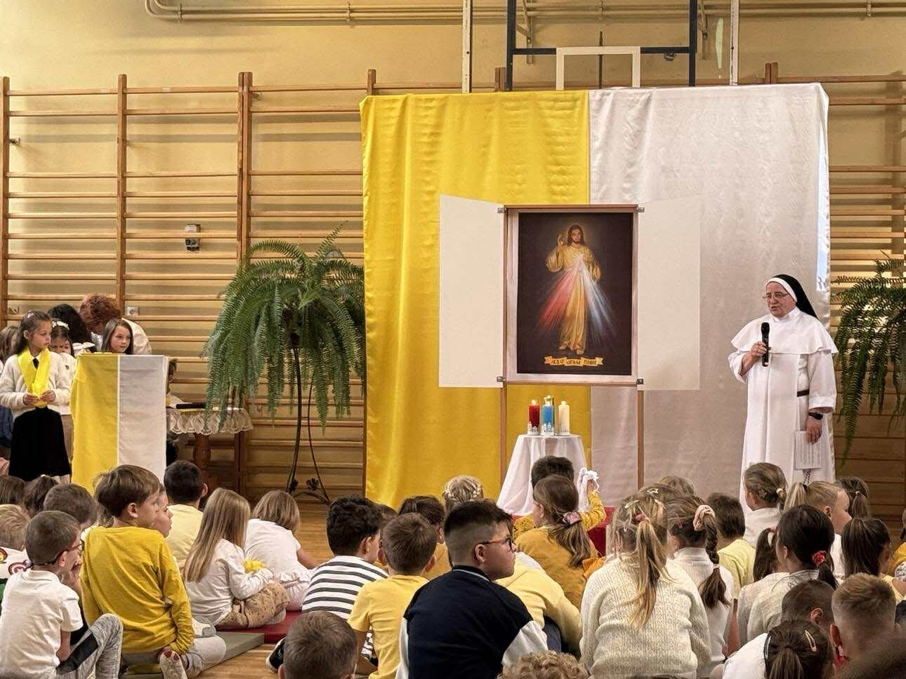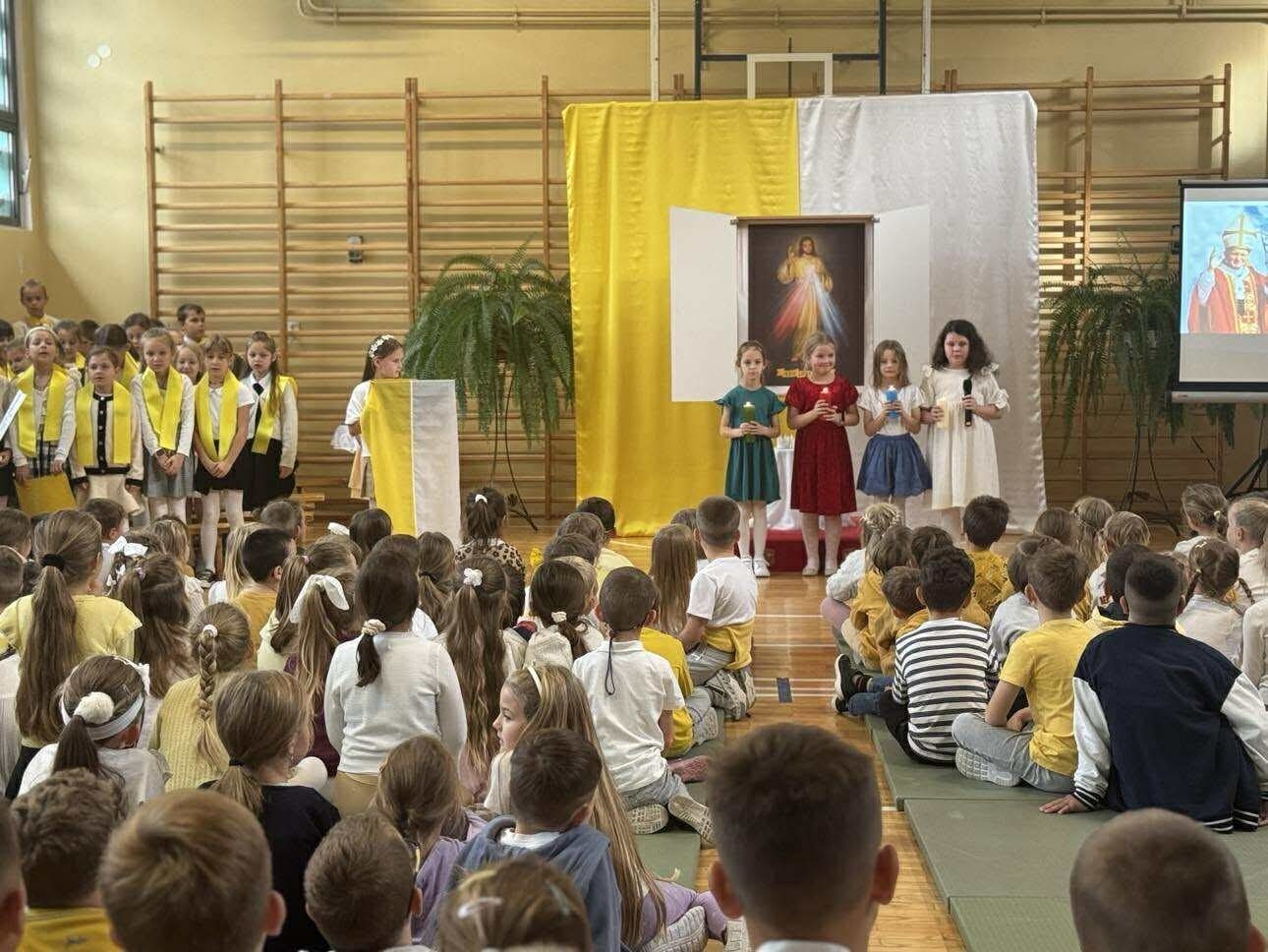 W czasie apelu przedstawiono najważniejsze wydarzenia z życia Jana Pawła II oraz słowa, które do dziś są dla wielu źródłem siły i nadziei. Uczniowie recytowali wiersze, śpiewali pieśni, a całość uświetniła prezentacja multimedialna. W tym dniu w szkole panowała wyjątkowa, uroczysta atmosfera, którą podkreślały żółto-białestroje uczniów i nauczycieli. Oczywiście nie zabrakło tradycyjnych kremówek- rozprowadzanych przez szkolny Caritas.