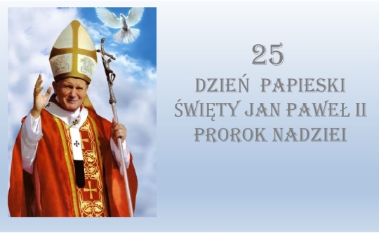 W naszej szkole w dniu 22 października obchodziliśmy jubileuszowy 25 Dzień Papieski, który w tym roku odbywał się pod hasłem „Św. Jan Paweł II – PROROK NADZIEI”. To wyjątkowe wydarzenie było okazją do wspólnego przypomnienia postaci Wielkiego Polaka, jego nauczania, dobroci i miłości do drugiego człowieka.