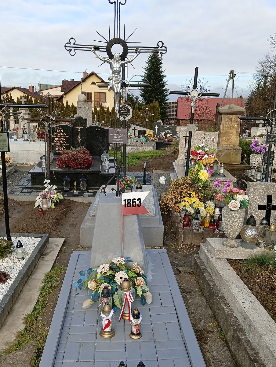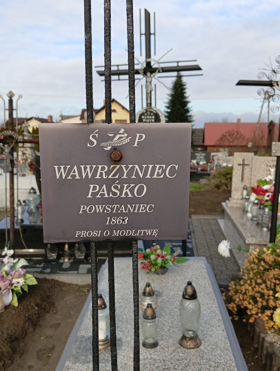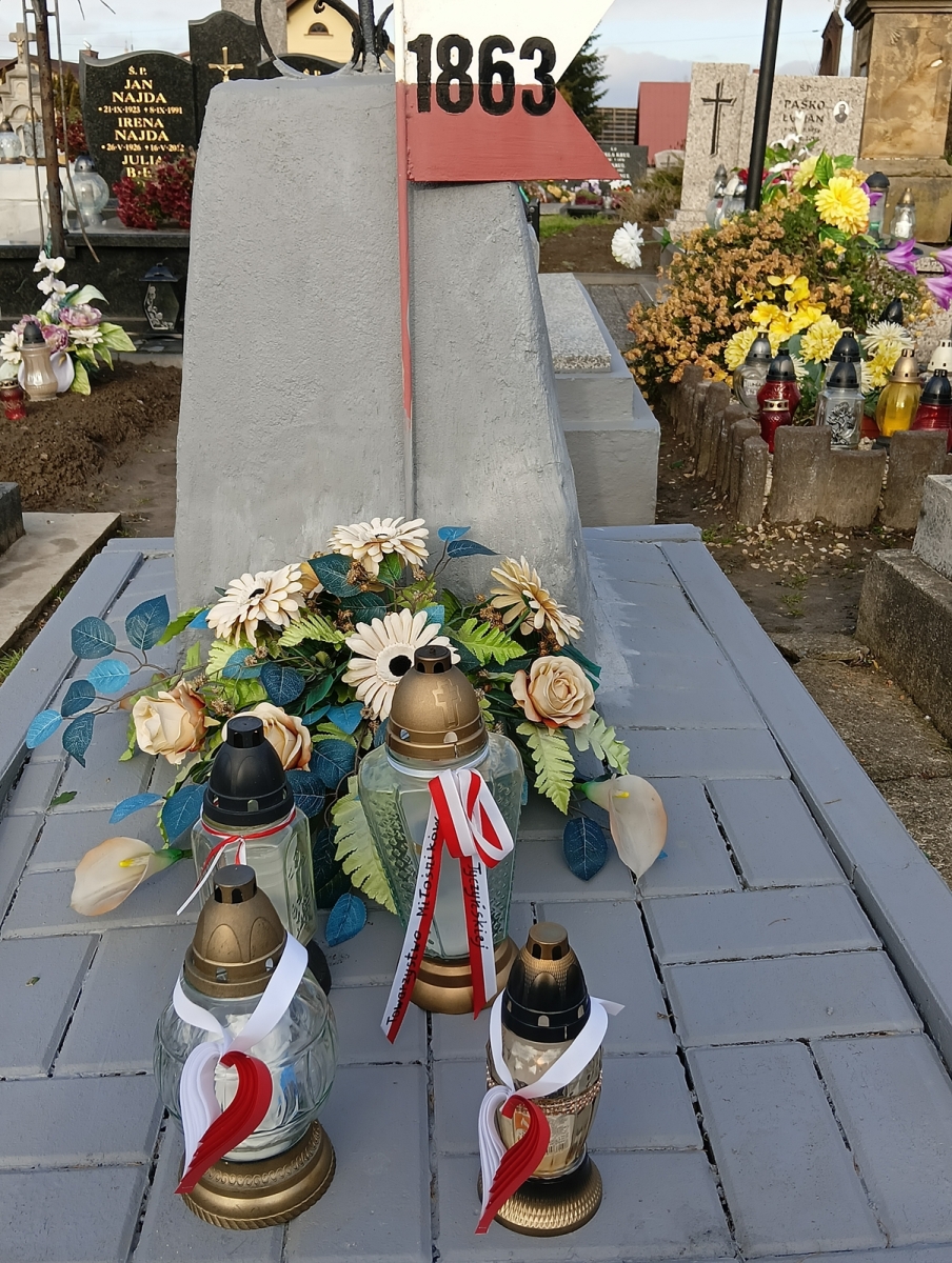 Znicze ozdobione biało-czerwoną wstążką zaplecioną w charakterystyczną formę serca zapaliliśmy na grobie powstańca styczniowego Wawrzyńca Paśko. Nagrobek znajduje się w północnej części cmentarza parafialnego w Tyczynie.