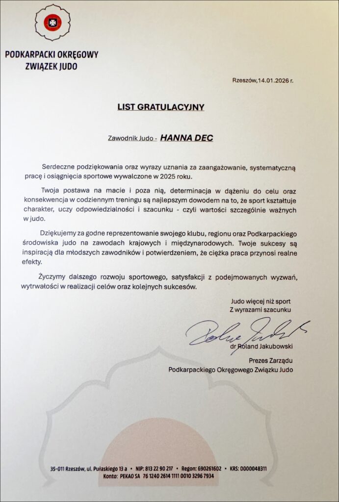 Z dumą informujmy, że nasza uczennica Hania Dec kl. 5a otrzymała List Gratulacyjny od Podkarpackiego Związku Judo, wyróżniający ją za wysokie osiągnięcia sportowe w 2025 roku. Hania jest najmłodszą zawodniczką, której przyznano takie wyróżnienie. Cieszymy się bardzo i gratulujemy!
